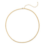 The Rocksbox Demi Fine Flat Curb Chain is a high polish 18k gold plated over sterling silver that is 16" long with a 3" extender and displays a smooth and modern design.