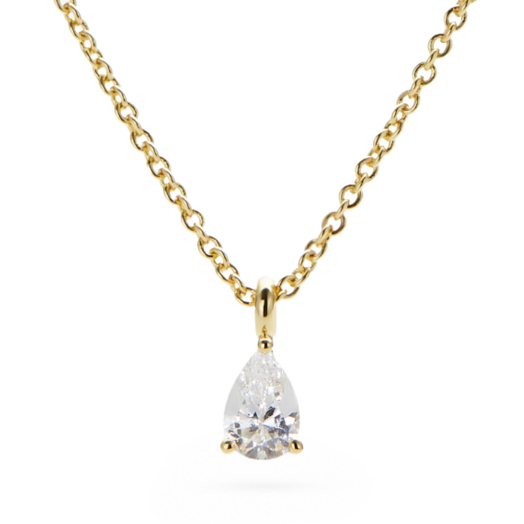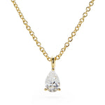 The delicate solitaire pendant with a pear-shaped cubic zirconia gemstone set in prongs gives this gold chain necklace an elegant touch. Dipped in 14K gold and with a subtle sparkle, this necklace creates an updated look for any outfit and can be worn alone or layered with other necklaces. Versatile enough to wear with more formal outfits, as well as casual pieces, this delicate solitaire pendant is a must-have this season.