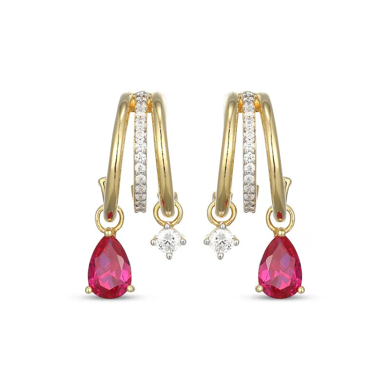 Pear-Shaped Lab-Grown Ruby & Lab-Grown Diamond Split J-Hoop Earrings 1/5ct tw 24K Yellow Gold Vermeil Sterling Silver