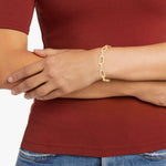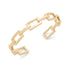 The Slate Huxley Cuff is a high polish gold bracelet that is 2.5” in length and is adjustable. This piece has a smooth design of an elongated linked chain.