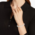 The Slate Huxley Cuff is a silver bracelet that is 2.5” tall with a span of 2.4". This piece has a smooth design of an elongated linked chain.