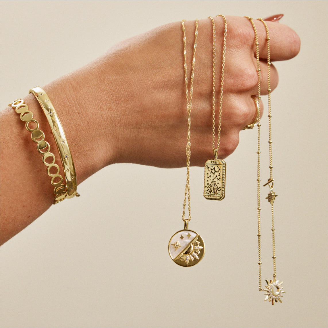Reinterpreted from the sunlit silhouette, meet the Sunlit Crescent Gold Necklace. This 14K gold-plated piece features a crescent motif embedded within a pave embellished pendant, along with a mini toggle on its chain that has a falling star charm. Wear this necklace styled on its own or layered with another fave.