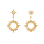 Turn your face to the sun, and leave the shadows behind. An intricately carved pendant in the shape of a sunburst is the highlight of the Sunseeker Earrings. Strikingly beautiful, this 14K gold plated statement piece is made with a cut-out centre, studded with petite cubic zirconia crystals that resembles sun rays and dangling off a shiny wishing star stud.